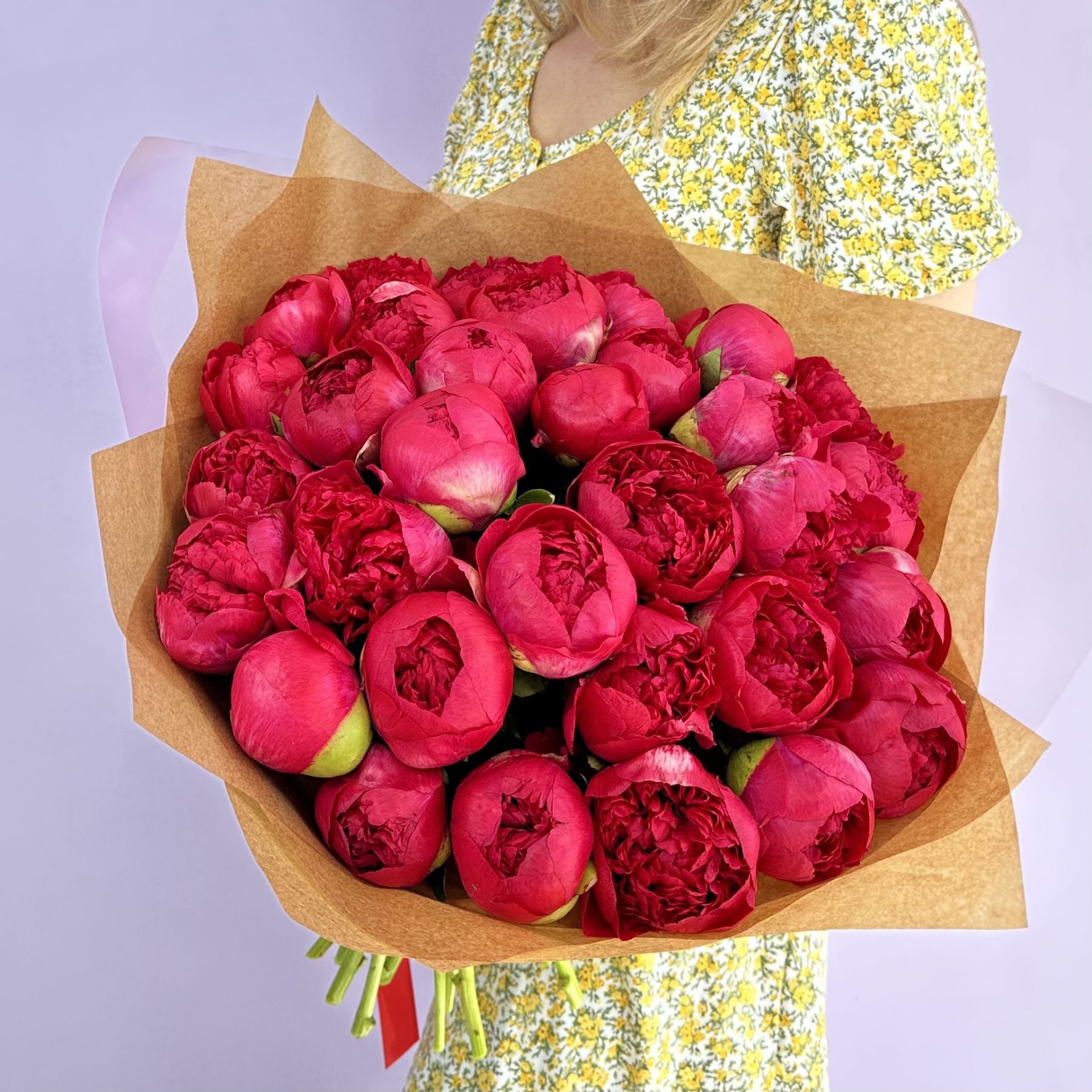 Букет из 33 пионов в крафт бумаге . Цвета в ассортименте